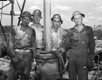 Young County oil development. Members of the crew on the Shell Oil Company, Incorporated, Number 1 J. M. Bloodworth, north offset to the discovery; left to right, R. D. Berry, J. J. Lawson, L. F. Groves, J. A. Burnett. They are standing next to each other and posing for a picture. Published in Fort Worth Star-Telegram, morning edition, May 11, 1941.