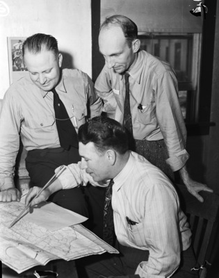 Young County oil development. Olin Calvin, Olney business man, seated, with Roy J. Graham, rancher, and Leo Kuehn, secretary of Chamber of Commerce, standing. They are looking at a map and discussing. Published in Fort Worth Star-Telegram, morning edition, May 11, 1941.