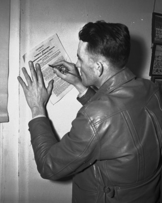 The Fort Worth Cats star pitcher, Ed Greer, is signing his 1940 contract. Greer is thirty-nine years old and has been with the Cats since 1936. His back is to the camera as he props the contract against the wall to sign. He is wearing a leather jacket. Published in The Fort Worth Star-Telegram Morning Edition February 08, 1940.