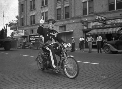 Shriners. Ring candidates. City Motorcycle officer Ralph Slover, a ring candidate on his put-put bicycle.