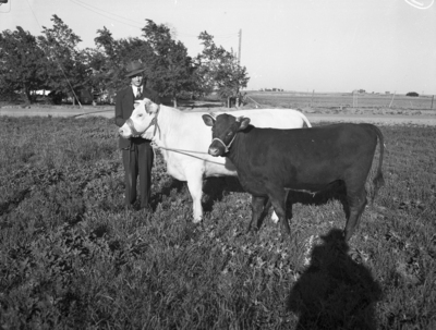 The 13th annual Panhandle Plains Dairy Show is kicking off in Plainview, Texas. The show is exhibiting top dairy cattle and dairy products. Alton Chapman, of Floydada, Texas, is shown with two of his milking Shorthorn cows. The snow white cow is "Defenders Hillview Lady," while the other is "Duellen Musicale." Mr. Chapman is standing at the halter of Lady, dressed in a hat and a three piece suit.