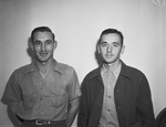 Freddy Martin (left), Houston Buffaloes pitcher, standing next to an unidentified man. The two men are standing in front of a blank wall, looking at the camera and smiling. Martin is wearing a button-up, short-sleeve shirt that has two large pockets on either side of the front.
