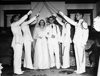 Lieutenant Alfred Edwin Coffey and his bride, the former Frances Louis Taylor, passed under an arch of sabers held by four military ushers when the couple left the altar of St. Andrew's Episcopal Church after taking their marriage vows Sunday night. Left to right are Lieutenant F. E. Ball, Lieutenant Dorsey McCrory, the bride, the bridegroom, Lieutenant Matt C. C. Bristol Junior and Lieutenant W. E. Kernan. The bridegroom and honor guard are stationed at Fort Sam Houston. All the Lieutenants are wearing dress white uniforms. Mrs. Coffey is in her wedding dress and veil, arm-in-arm with her new husband and holding a book in her right hand. A fireplace is behind the couple. Published in The Fort Worth Star-Telegram Morning Edition May 12, 1941.