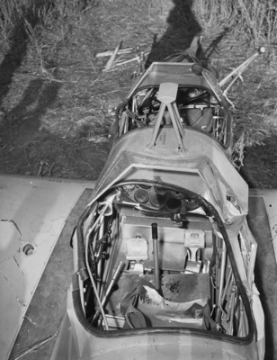 Hicks Field casualty. The wrecked plane of Cadet Robert A. Whitfort, 23, Memphis, Tennessee. Fort Worth Star-Telegram Morning Edition. 1941-05-13. Photograph of the partially destroyed fuselage of a military aircraft after a crash. The cockpit is featured prominently in the photograph.