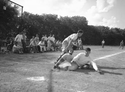 Baseball High School. Action shot of Arlington Height-Paschal game. Charley Ward, shown sliding, of Arlington Heights, and Catcher Bill Morton of Paschal.