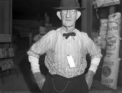W. E. England, 82, of Seymour, Texas, owns land adjoining the oil production in Baylor County. He has been in West Texas for 36 years. He is wearing a striped, long-sleeve collared shirt, a bow tie, a hat, eyeglasses and trousers.