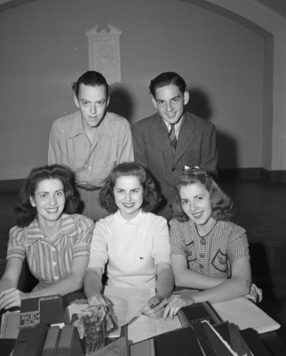 Five of the cast of "The Wagon to the Star," senior class play to be presented at Arlington Heights High School. Seated at a table, left to right, front row, are Billie Forman, Martha Hyer and Royane Olmsted. Standing, back row, are Tommy Bigham, left, and Bob Major. On the table are several books, including one titled "Prose and Poetry Appreciation." Also on the table is a vase filled with flowers. The girls are wearing dresses, Mr. Bigham is wearing a shirt and trousers and Mr. Major is wearing a suit.