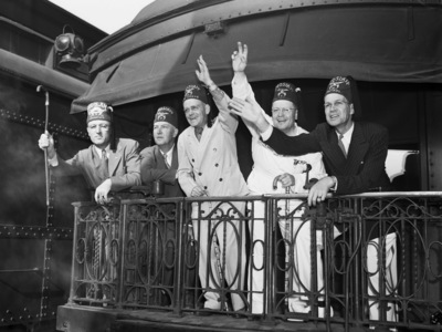 Waving from the platform at All-State Shrine Ceremonial, San Antonio, Texas, left to right, Potentate Houston Hill, Assistant Rabban H. A. Lawrence, Rabban Jack McGraw, Assistant Recorder Ward Collier and Rocerder Star Williams.