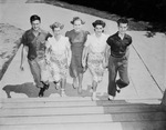 Among the leads in the annual senior class play of Technical High School are, left to right, J. N. Brown, Shirley McCullough, Gloria McAllister, Betty Ann Potts and Bobby Christy. The play, "Pulling the Curtain," will be presented in the auditorium of James P. Elder Junior High School with Charles Herring (not pictured), class sponsor, as director. The five teenagers are shown walking up a staircase. They are all holding hands. The boys are wearing trousers and button-up shirts. Miss McAllister is wearing a dress and Miss McCullough and Miss Potts are wearing identical blouses and floral print skirts.
