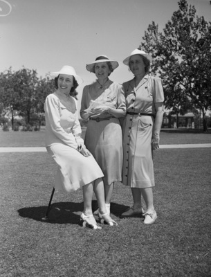 Women golfers. Left to right, Mrs. P. K. French, Mrs. Walter Stark and Mrs. George Thompson. Here, they are modeling appropriate fashion for the Open Golf Tournament to be held on June 5-7 at Colonial club. Mrs. French is wearing a two-piece suit, Mrs. Stark and Mrs. Thompson Jr. are wearing belted dresses. They have low-heeled shoes and hats. Published on May 20, 1941.