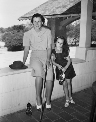 Women golfers. Mrs.Frank Goldthwaite, changing out into golf oxford shoes with the help of her little daughter, Aniela. They model appropriate fashion for the Open Golf Tournament to be held on June 5-7 at Colonial Club. Mrs. Goldthwaite wears a tan rouge blouse with matching skirt of gabardine, and Aniela is in a green pinafore with striped blouse. Published on May 20, 1941.