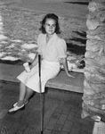 Women golfers. Miss Jerry Goodrich, stopping for refreshment at the nineteenth hole. She models what young golfers wear. She wears a navy blue and green dotted white wash blouse, a white sheer flannel skirt, brown and white cleated oxfords and yellow socks. Young golfers do not wear hats to play golf in. Published on May 21, 1941.