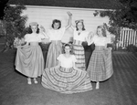 Image shows five members of Ka-ya-ki-ta Camp Fire Group dressed in Mexican "peasant costumes" for folk dancing on the lawn of Mr. and Mrs. George L. Rand's home. Seated is Suzanne Williams. Standing, left to right, are Helen Wilson, Wanda Longeway, Dorothy Jean Cline and Patsy Ann Rand. Their costumes include a long, striped skirt, blouse, and a hair band. The four girls standing behind Miss Williams are holding hands. Published in the Fort Worth Star-Telegram evening edition May 20 1941.