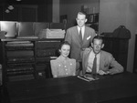 Earleen Polk, Chile McKinney and Jack Billingsley, three officers of the 1941 senior class of Texas Christian University (T. C. U.), admire a photograph of university president Doctor E. M. Waits as they study plans for having the president's portrait painted as their gift to the school. Miss Polk and Mr. Billingsley are sitting at a table and Mr. McKinney is standing behind them. On the table is the photograph of Doctor Waits. The senior class will join faculty and ex-students in contributing to the portrait of Doctor Waits, who will retire as president after the commencement on June 2, 1941. Mr. McKinney and Mr. Billingsley are wearing suits and Miss Polk is wearing a dress.