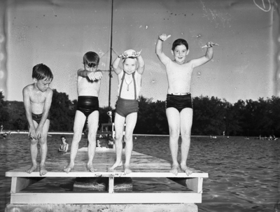 Opening of Fort Worth wimming pools. Group at Forest Park pool includes (left to right) Johnny O' Connell, Leonard Darrell Reed, Mary Nell O'Connell and Robert McKinney.