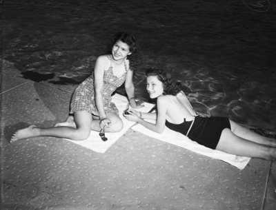 Opening of Fort Worth swimming pools attendees Earnestine Mayer (left), 13, daughter of Mr. and Mrs. J. B. Mayer, and Gloria Weathers, both shown taking a sun bath.