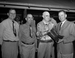 Stamford-Alredge Flying Field dedication. Left to right. W. B. Tayman, president of Stamford of Chamber of Commerce; Charles E. Coombes, Stamford; and Buck Rowe, commercial fliers of Dallas.