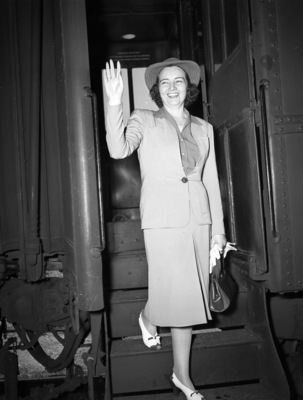 Miss Anne Holbrook, nurse and social worker, to supervise a WPA health program in Puerto Rico, shown as she waves goodbye from train.