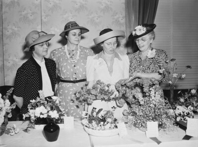 The garden section of the Fort Worth Business and Professional Women's Club celebrated its first birthday with a flower show at Hotel Texas, using winning entries to decorate tables at the club's regular luncheon. Looking at some of the best arrangements are, left to right, Miss Lucie Lee Carley, luncheon chairman; Mrs. Gaither Miller, whose entry was a winner; Mrs. Paul V. Barmann, also a winner, and Mrs. Bert Barber, chairman of the garden group. Miss Carley is wearing a blouse, a polka-dot blazer with a matching skirt, and a hat. Mrs. Miller is wearing a floral print dress belted at the waist, a multi-strand necklace and a hat. Mrs. Barmann is wearing a a striped blouse, a blazer, skirt and a hat. Mrs. Barber is wearing a floral print dress and a hat with a flower pinned to it.