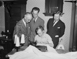 Billy Aycock, operating a serging sewing machine at the Lighthouse for the Blind as members of the Lions Club look on. They are, left to right, R. C. James, Sam A. Justin and Owen M. Jones. Mr. Aycock sits in front of the machine and demonstrates its operation. The three Lions Club members, all dressed in suits and ties, stand behind to observe. This photograph was published in the May 21, 1941 morning edition of the Star-Telegram.