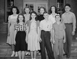 These students were victors in the recent Who's Who poll conducted at E. M. Daggett Junior High School. Left to right, front row, Billye Bob Keith, most courteous girl; Tahlie Gunn, most democratic girl; Wooten Brown, most democratic boy; and Dan Walker, outstanding personality boy. Back row, Freda Dunn, best-all-around-student; Phyllis Ward, smile queen; Pat Fitzhugh, outstanding personality girl; Sharon Cheek, posture queen; and Egon Heartfield, most courteous boy. All students are seen standing on the steps outside. Gene Ratliff, smile king, is not in the picture.