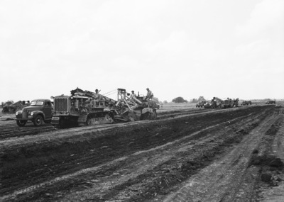 Bomber plant construction work. Machine tearing up the ground.