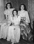 Seated left to right are Miss LaVerne Milligan, Miss Mary Katherine Shamburger and Miss Jeanne Cox, June graduates of Polytechnic High School, who were hostesses at an open house at the home of Mr. and Mrs. W. H. Shamburger, 4619 Nolan Street. Miss Milligan and Miss Shamburger are wearing floor-length dresses and Miss Cox is wearing a long-sleeve blouse and floor-length skirt.