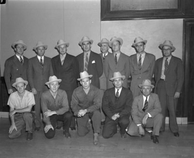 Texas Christian University (T. C. U.) football team at Shady Oak Farm wearing Shady Oak hats, 05/21/1941