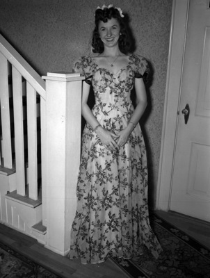 Frankie Bess Williams, June 1941 graduate of Amon Carter High School, seen standing by the stairs in a long flowery gown, smiling for the picture. She has been honored at a dance at Meadowbrook Country Club.