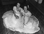 Miss Martha Tolbert (left) and Miss Georgia Isbell, Polytechnic High School graduates, whose date books have been filled with parties that accompany the close of school. Miss Tolbert is the daughter of Mr. and Mrs. Bryant N. Tolbert. Miss Isbell is the daughter of Mr. and Mrs. I. I. Isbell. The two girls shared honors at a partty given by their mothers at the Tolbert home. During her four-year high school career Miss Isbell was not absent a day. The young ladies are sitting next to each other on a rug with their dresses fanned out around them, both are holding a handkerchief, looking up at the camera. Miss Tolbert is wearing a corsage and Miss Isbell is wearing a jeweled necklace. Published in The Fort Worth Star-Telegram Morning Edition June 15, 1941.