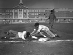 Walter Taylor, left, Polytechnic High School left fielder, being tagged out at third base by Jim Henderson, Paschal High School third baseman. Henderson is tagging Taylor on the shoulder as Taylor reaches for the base. Polytechnic won the game 11-1. A referee is standing in the background at the right. The players are wearing their respective uniforms.