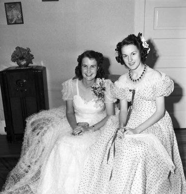 Miss Martha Tolbert (left) and Miss Georgia Isbell, Polytechnic High School graduates, whose date books have been filled with parties that accompany the close of school. Miss Tolbert is the daughter of Mr. and Mrs. Bryant N. Tolbert. Miss Isbell is the daughter of Mr. and Mrs. I. I. Isbell. The two girls shared honors at a party given by their mothers at the Tolbert home. During her four-year high school career Miss Isbell was not absent a day. The young ladies are sitting next to each other on a rug with their dresses fanned out around them, both are holding a handkerchief, looking up at the camera. Miss Tolbert is wearing a corsage and Miss Isbell is wearing a jeweled necklace. Published in The Fort Worth Star-Telegram Morning Edition June 15, 1941.