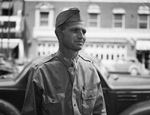 An unidentified man from Camp Wolters is standing on the street. Several automobiles and a building are in the background. The man is wearing a military uniform and is likely a private in the Army. Published in Fort Worth Star-Telegram, evening edition, May 28, 1941.