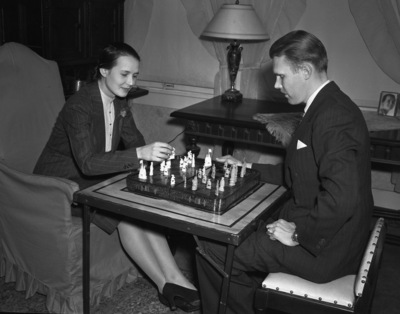 Mr. and Mrs. George W. Polk, Junior are playing chess at the home of his mother, Mrs. Adelaide Roe Polk. The couple has had a round-world romance. They began their acquaintance in Manila, Philippines. They were later married in Paris, France the day war was declared. Mr. Polk bought the antique ivory chess set from a man in Shanghai, China. Mrs. Polk is sitting on a armchair, dressed in a blouse, pinstripe blazer and matching skirt. Mr. Polk is wearing a double breasted striped suit. Published in the Fort Worth Star-Telegram morning edition, February 5, 1940.