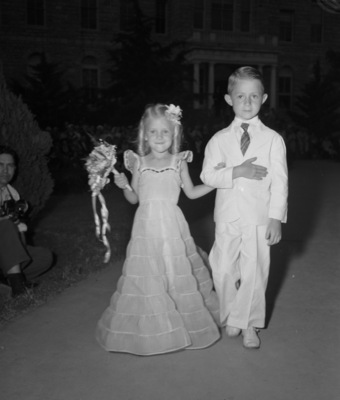Texas Wesleyan College is celebrating a three-day homecoming Saturday in observance of the fiftieth anniversary of their institution. Two homecoming children attendees Sandra Ann Crouch and W. M. Holcomb Junior (Jr.), Fort Worth, Texas, are pictured here. Sandra is the daughter of Registrar and Mrs. Paul Crouch. She was flower girl for the May Festival. She is wearing an evening gown and holding a bouquet in her right hand. Holcomb, Junior (Jr.) was Sandra's escort. He is wearing a white suit. Published in the Fort Worth Star-Telegram morning edition, May 25, 1941.