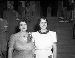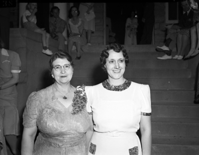 Former students of three eras of the school joined in opening exercises of a three-day homecoming Saturday in observance of the fiftieth anniversary of Texas Wesleyan College (T. W. C.). Two homecoming attendees dowager queens in the May Festival, Mrs. H. N. Cochran (Left), Fort Worth, Texas, and Mrs. E. T. Pittard of Anson, Texas are pictured here. Both are ex-students of old Polytechnic College, and Texas Woman's College, respectively, the precursor to Texas Wesleyan College. They are wearing dresses and standing side by side and smiling for the camera. Mrs. Cochran is the mother of the May queen, June Cochran Young. Mrs. Pittard was May queen in 1919. Published in the Fort Worth Star-Telegram morning edition, May 25, 1941.