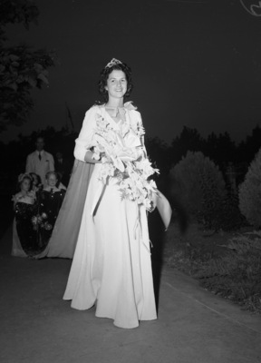 Young, June Cochran; Texas Wesleyan College; Texas Wesleyan University; Homecomings; May Queen; Evening gowns; Capes (Clothing); Crowns; Flowers