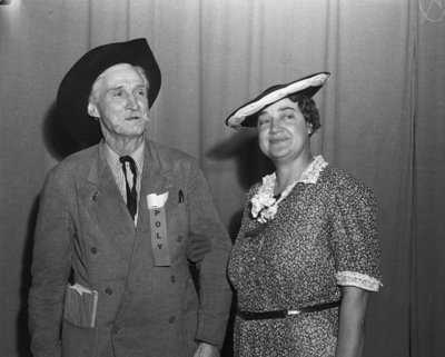 Shown here are Texas Wesleyan College (T. W. C.) homecoming attendees W. M. (Bill) Swart, Dallas, Texas (left) and Mrs. Frances Booth Defee. Mr. Swart is wearing a suit, collared shirt, tie, and hat. A ribbon is pinned to his jacket that indicates he is a Polly College ex-student. Mrs. Defee is wearing a lace collared dress and a hat. Both are standing side by side, facing front and smiling.