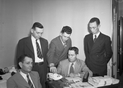 Shoeman's convention. Gaston Grisham, left, of De Leon, and J. M. Connor, Ballinger, both seated, and standing, left to right, E. J. Barnes, Winters; DeLoyn Singleton, De Leon, and Wayne Swift, Rising Star.