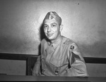 Sergeant J. M. Coffey, of the military police, Camp Bowie, who was in the first group of Fort Worth, Texas, selectees going to the camp at Brownwood, Texas, on January 16, 1941. He received a promotion from private to supply sergeant. Coffey in private life was a cashier in the treasury department of Sinclair Refining Company. He is shown sitting in a chair in front of a blank wall.