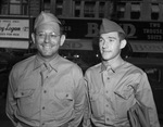 Private M. H. Trifon, of Camp Barkeley, and Second Lieutenant W. H. Carmichael, of Camp Wolters, were on a weekend leave in Fort Worth, Texas. Both soldiers are in support of the proposed recreation center to be funded by the United Service Organization for National Defense campaign. They are standing outside in front of a row of stores and shops.