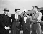 Globe Aircraft Corporation introduces first aircraft produced at the plant; from left, H. S. Johnson, designer; Kilbourne H. Knox, engineer; John Kennedy, company president and J. V. Boyer, flight superintendent, at Hicks Field, Fort Worth, Texas.