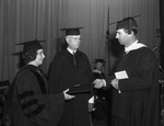As an honorary degree of doctor of literature was conferred Monday on Mrs. Ben J. Tillar of Fort Worth by Texas Wesleyan College (TWC). President Law Sone (right) of the college is shown presenting the degree, after Mrs. Tillar had been introduced by J. W. Mitchell (center), Fort Worth, during the fiftieth annual commencement in the Fine Arts auditorium. Everyone in the picture is wearing graduation gown and cap. Published in the Fort Worth Star-Telegram morning edition, May 27, 1941.
