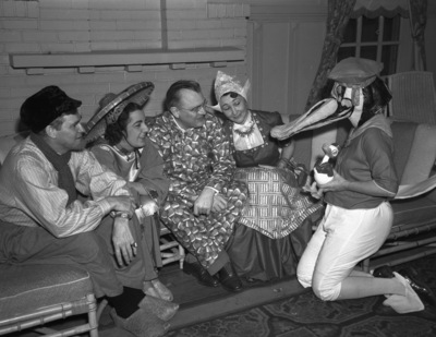 A Masquerade Ball is being held at the River Crest Country Club for the benefit of the Day Nursery Association. Attending the party in their creative costumes are left to right, Harry Brants, Mrs. F. Kirk Johnson, George Thompson Junior, Mrs. Harry Brants and Mrs. George Thompson Junior. Mr. Brants is dressed as a Dutchman. He is wearing a hat, fake bear, scarf, button-up shirt, trousers, and clogs. Mrs. Johnson is wearing a Mongolian costume complete with a straw hat and a robe. Mr. Thompson is dressed in his red pajamas. Mrs. Brant, like her husband, is wearing a Dutch costume with a Dutch bonnet and dress. They are seated on a couch being entertained by Mrs. Thompson who is wearing a homemade Donald Duck costume. She has a sailor hat, cardboard bill, a blue shirt and white trousers. She is also carrying a Donald Duck figurine. Published in the Fort Worth Star-Telegram morning edition, February 4, 1940.