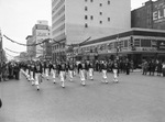 A scene from the Shriners Parade. The people in the parade are moving through a street.