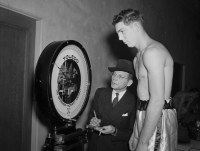 Fort Worth is hosting the district Golden Gloves tournament at Will Rogers Memorial Coliseum. Buster Burrell is being weighed in by Gloves Director Dick Dixson. Burrell is a strong contender in the light-heavyweight division. He will meet Herman Choate in the finals at the Coliseum. Mr. Dixon is dressed in a hat and a double breasted pinstripe suit. Burrell is wearing boxing trunks.
