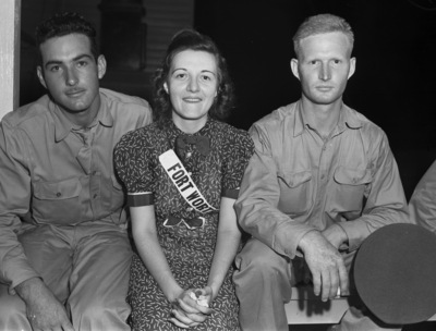 Young women from Fort Worth, Texas, attended a dance at Camp Bowie. Shown sitting down during the festivities are, left to right, Private L. S. Kerr, of the 1st Battalion Headquarters Detachment, 141st Infantry, Miss Mary Frances Taylor and Private Clyde White, of Company C, 111th Quartermaster Regiment. The soldiers are wearing their military uniforms. Miss Taylor is wearing a dress and a sash across her chest that reads, "Fort Worth." Private White is holding a cigarette in his right hand.
