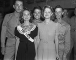 Young women from Fort Worth, Texas, attended a dance at Camp Bowie. Shown at the party are, left to right, Corporal Robert Clemmons, of Company M, 144th Infantry, Miss Catherine Jones, Corporal E. D. Jones, of Headquarters Company, 144th Infantry, Miss Edythe Jones and Private V. C. Henderson, of Company A, 143rd Infantry. The soldiers are wearing their military uniforms. Miss Catherine Jones is wearing a dark-colored dress with lace details on the collar and sleeves, and a sash across her chest that reads, "Fort Worth." Miss Edythe Jones is wearing a dress with floral details on the collar and sleeves.