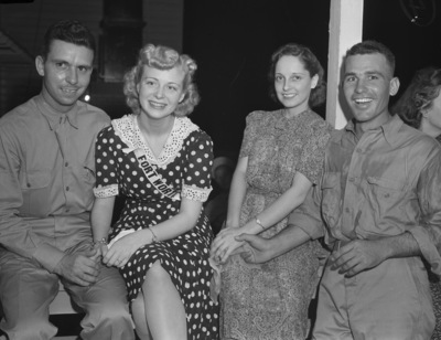Young women from Fort Worth, Texas, attended a dance at Camp Bowie. Shown at the dance are, left to right, Private Ed Miller, staff section, Regimental Headquarters of the 142nd Infantry, Miss Violet Rudd, Miss Pauline Risher and Private Lee McClanahan, of Company K, 141st Infantry. The soldiers are wearing their military uniforms. Private Miller, Miss Rudd and Miss Risher are sitting on a counter. Private McClanahan is standing to the side. Miss Rudd is wearing a polka-dot dress with an eyelet pattern on the collar and edge of the sleeves, and across her chest is a sash that reads, "Fort Worth." She has a charm bracelet on her right wrist and a watch on her left wrist. She is holding Private Miller's hand. Miss Risher is wearing a floral print dress and has a watch on her left wrist. She is holding Private McClanahan's hand.