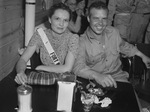 Young women from Fort Worth, Texas, attended a dance at Camp Bowie. Shown sitting down at a table during the festivities are Miss Dorothy Williams, left, and Private Curtis M. Polk, of the Antitank Company, 141st Infantry. Private Polk is wearing his military uniform. Miss Williams is wearing a floral print dress and a sash that reads, "Fort Worth." She is holding a cigarette in her right hand. On the table is an ashtray, a napkin dispenser and a container of sugar.